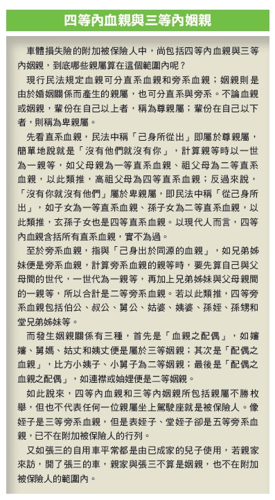 車損險被保險人的範圍,看似極廣,但是像親家、表姪子或堂姪子等卻不屬於四等內血親或三等內姻親,所以不是車損險認定的被保險人。
