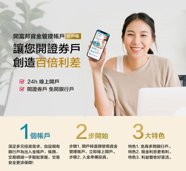 只要透過富邦證券全年無休的「快速線上開戶」系統,上傳證件後於流程中選擇「資金管理帳戶」,設定好出入金銀行及簽署契約,免下載APP,現在只要透過手機或電腦連上網路,5分鐘就能完成線上申請,投資人可以輕鬆開戶掌握投資契機,不受時空限制、不用親臨證券分公司及銀行,可以隨時隨地享受嶄新及便捷的開戶體驗。若有相關問題請至富邦證券網站(www.fbs.com.tw)或洽客服專線0800-073-588,由專人提供解答及服務。