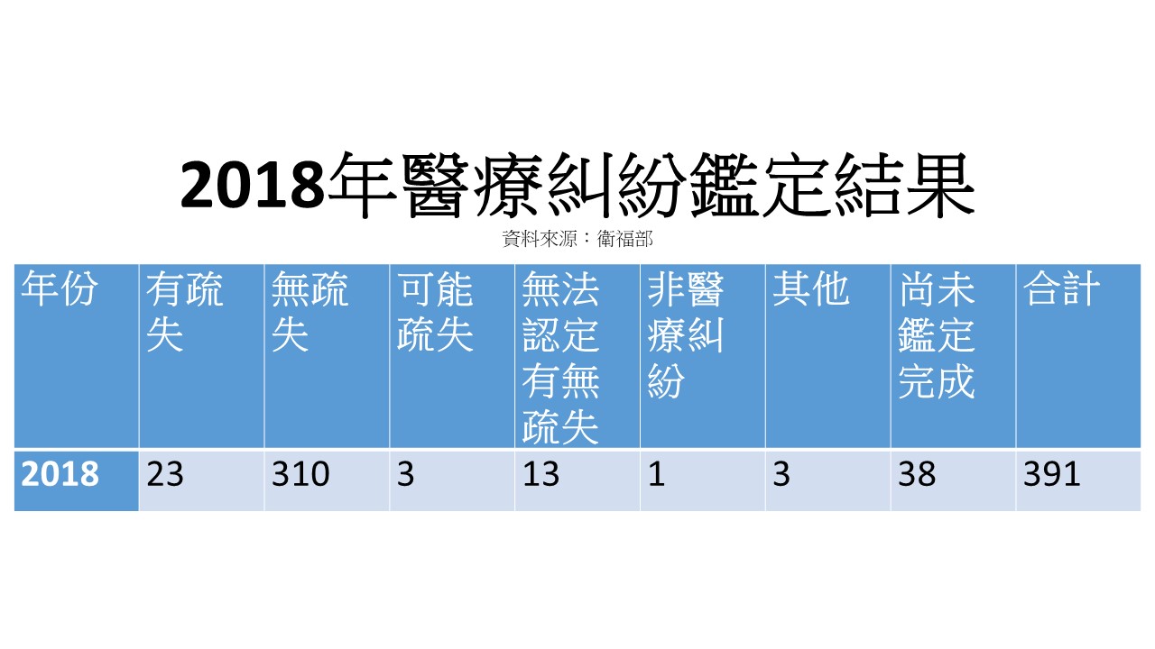 另一方面,衛福部統計,去(2018)年共有391起醫療糾紛委託醫事鑑定,其中鑑定結果認為醫師有疏失僅占23件(5.9%)、無疏失占310件(79.3%)。換言之,民眾眼裡認為是醫療疏失的案件,以醫界的觀點來看大多是「莫須有」之罪。