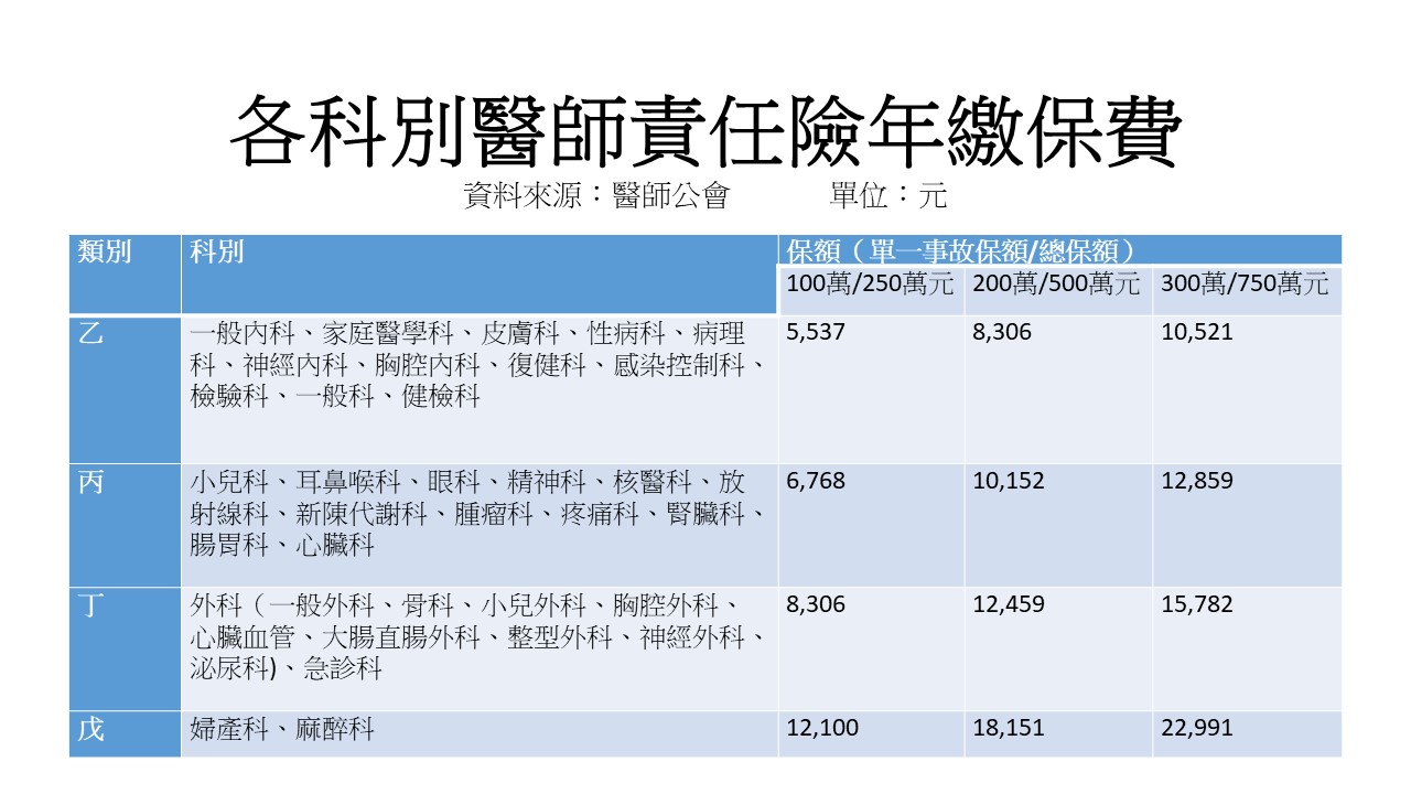 既然醫師有疏失的比例僅5.9%,代表醫責險能派上用場的機會也不高,但醫責險最為人詬病的卻是「保費太貴」,醫師責任險保費等級分為甲、乙、丙、丁、戊5個等級,以風險最高的戊類婦產科為例,單一事故保額100萬元下,年繳保費高達5.9萬元。