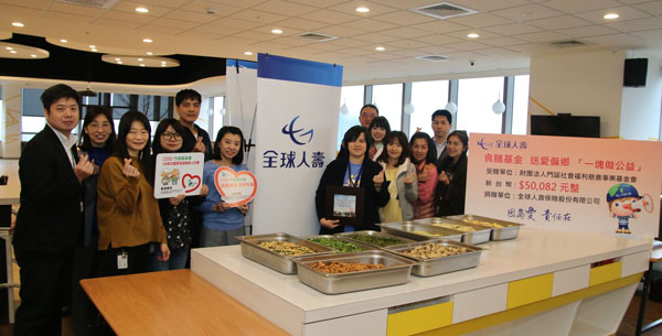 全球人壽持續推動「一塊做公益」活動,結合團膳廠商及每位同仁的力量,只要售出一份團膳便當,就回饋1塊錢做公益捐贈基金,若累積達新台幣5萬元善款,就會捐予公益團體。全球人壽表示,2019年為全球人壽歡慶25周年,也是「一塊做公益」活動累積善款第三度突破5萬元,並於今日(12月5日)於全球人壽總部17樓同仁餐廳舉行「食膳基金 送愛偏鄉 「一塊做公益」」捐贈儀式,合計共新台幣50,082元整,捐予花蓮門諾基金會,響應「送愛偏鄉,好好吃飯」公益活動,讓團膳基金溫暖東部偏鄉長輩們的胃,好好吃飯。