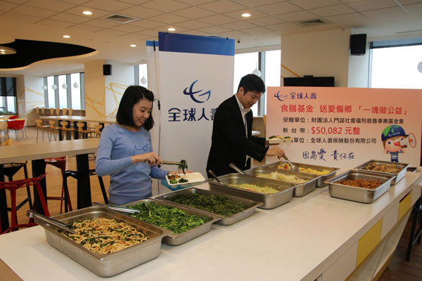 全球人壽「一塊做公益」活動至今已邁入第三年,陸續捐贈團膳善款予忠義基金會幫助失依兒少餐費、心路社會福利基金會,助心智障礙之慢飛天使在成長路上能展翅高飛;今年更響應門諾基金會「送愛偏鄉,好好吃飯」公益活動,讓偏鄉日照中心或獨居的偏鄉長輩們都能「好好吃飯」。全球人壽人資長陳幸琦表示,公司遴選優質團膳廠商提供CP值高的團膳給同仁們選用,每日提供2樣主菜、4樣副菜及附湯、白飯與糙米飯,可減輕同仁們外食的經濟負擔並顧及營養均衡;而在遴選團膳廠商的同時,也秉持著CSR善循環的概念,邀請團膳廠商參與「一塊做公益」活動,鼓勵同仁記得用餐也多多享用團膳,天天都能累積「一塊」做公益,回饋社會。