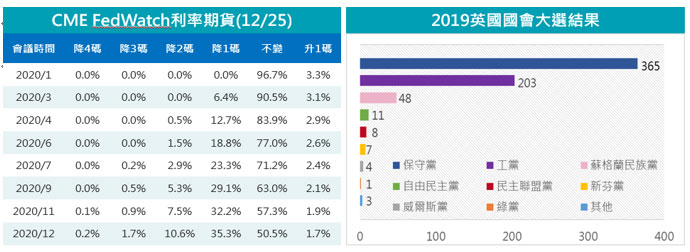 在英國國會大選方面,現任首相鮑里斯.強森的保守黨拿下365席,獲得過半的席次,有望推動英國順利脫歐。然而強森在大選後表示,選舉結果將會授權他完成脫歐任務,將在2020年1月31日前完成脫歐。但是令人擔心的並非英國是否脫歐,而是英國是否可以在有協議的情況下脫歐。雖然目前市場普遍認為無協議脫歐的情況發生機會不大,但隨著時間越接近,不免也使投資人開始擔心。