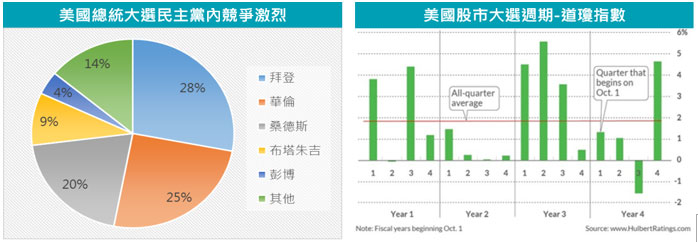 2020年美國總統選舉將於11月3日舉行,在此之前,總統初選將於2020年3月在愛荷華州舉行。哥倫比亞廣播公司新聞網節目Battleground Tracker的民主黨民調結果顯示,28%的受訪者支持拜登,而伊麗莎白·沃倫以25%支持率排名第二。根據統計數字,自1896年以來道瓊指數的表現,平均而言,美股的最佳表現往往出現在總統四年任期的第三年,選舉年前三季美股大盤指數仍多為正報酬。而在第四季(10至12月)股市則因為對新政府政策上的支持而也有不錯的表現。