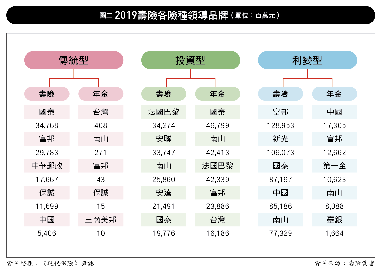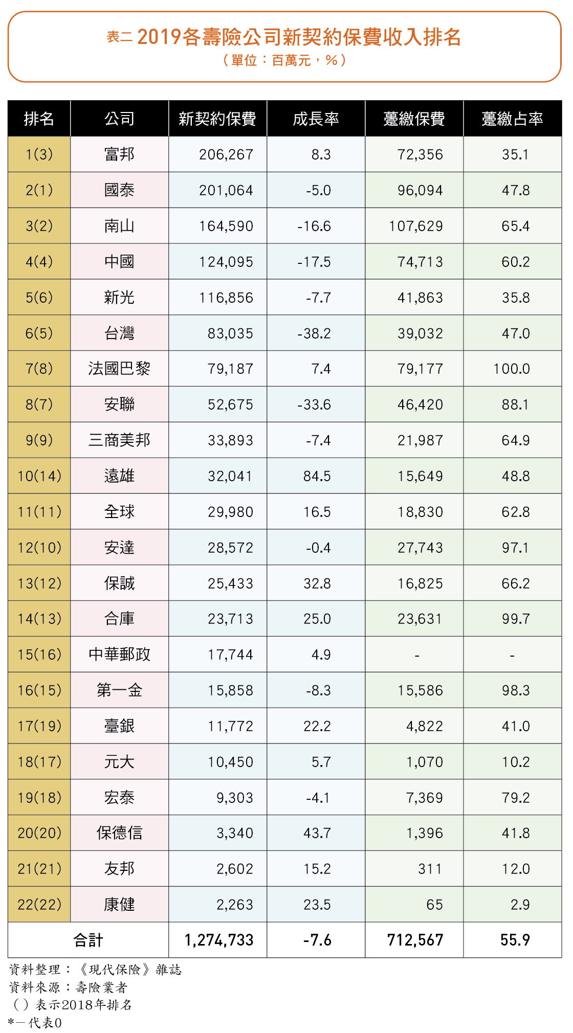 排名三、四、五的公司,也是保費達千億的唯三公司,分別是南山、中國與新光,其中南山與中國都衰退達一成七左右,同時也是前五大公司中躉繳占率超過六成的兩家。