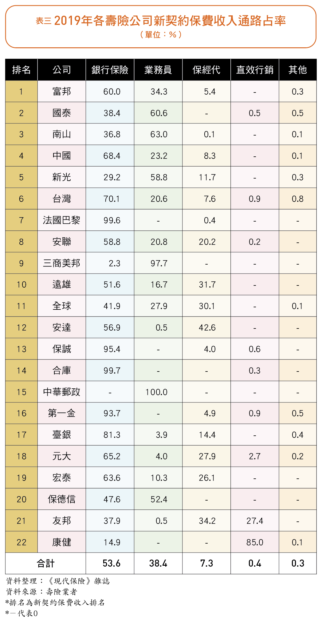 在自家業務員通路方面,除了受限於法令規定只有直接業務員通路的中華郵政,及三商美邦業務員通路占率高達九十七.七%外,其他二十家公司中,新契約保費來自業務員貢獻占率超過六成的公司,只有國泰及南山,超過五成的則是新光與保德信。前五大公司中,富邦來自自家業務部隊的貢獻,占率僅三成四,中國則只有二成三(詳表三)。面對死亡保障最低比例的實施、宣告利率持續下調,儲蓄險賣相不佳情勢下,今年銀行通路能否再撐起壽險一半江山令人存疑,這時候業務員通路的價值與重要性,就更顯得重要。