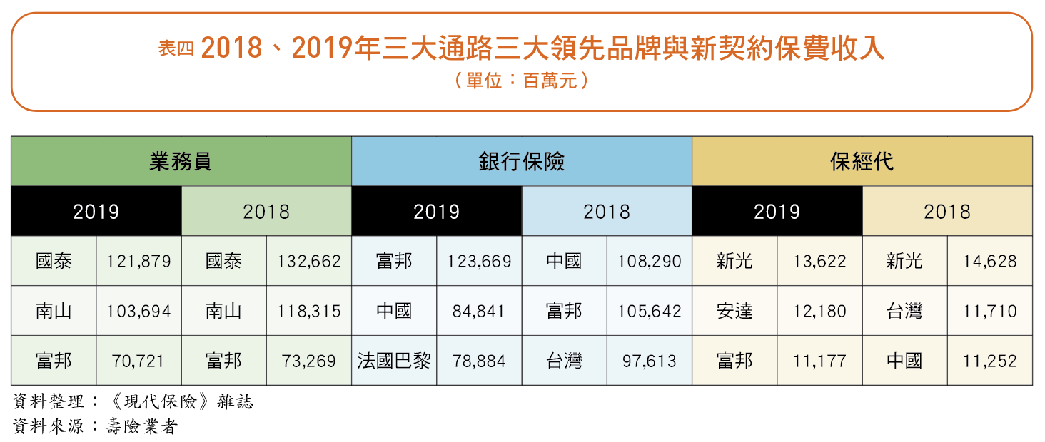銀行、業務員及保經代三大通路,過去兩年在三大領先品牌公司的排序,業務員通路都是國泰、南山與富邦;銀行通路前年是中國、富邦與台灣,去年則改為富邦、中國與法國巴黎;至於保經代通路,前年是新光、台灣與中國,去年則是新光、安達與富邦(詳表四)。