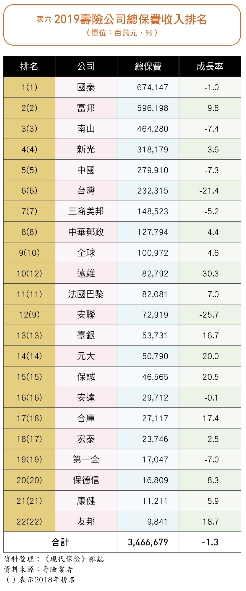 去年在新契約保費衰退七.四%之下,加計續年度保費後,總保費收入合計三兆四六六七億元,負成長一.三%。但總保費整體排名變動不大,國泰去年總保費負成長一%,但仍以六七四一億元保住龍頭地位,成為唯一總保費在六千億元以上的公司,富邦則以五九六一億元排名第二,但九.八%的成長率,使得與國泰的保費差距已從前年的一三七七億元縮減到去年的七八○億元。南山、新光與中國分居三、四、五名,南山負成長七.四%、中國負成長七.三%。第六到第十分別是台灣、三商美邦、中華郵政、全球與遠雄,這十大公司中,除了富邦外,只有新光、全球與遠雄總保費是正成長。