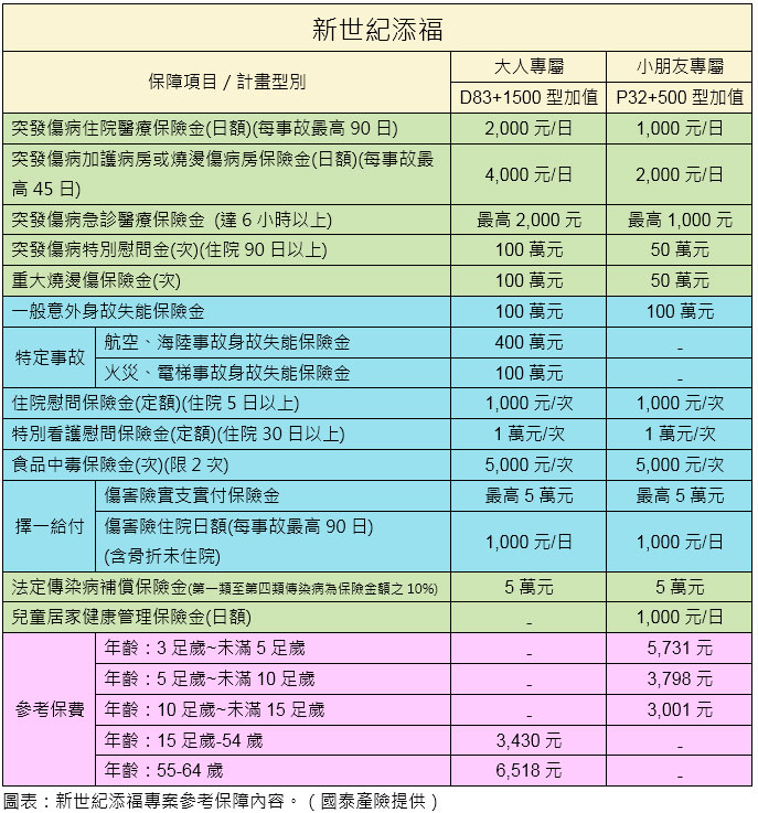 國泰產險此次升級改版的「新世紀添福」專案,凡是3足歲到64歲(保險年齡)皆可以購買,增加的保障即使在疫情趨緩時也可以發揮價值,能夠一直成為民眾的後盾-國泰產險is Helping。