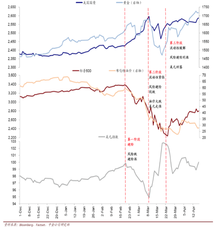 富邦證券表示,美股自2/19見到高點以來經歷了三個階段:(1)避險(2/19~3/9):歐美疫情升溫導致避險性資產如公債、黃金上漲,10年公債殖利率盤中一度達到0.3%;而標普指數、布蘭特原油等風險性資產下跌。(2) 流動性緊張(3/9~3/23):原油價格戰重挫油價加劇市場恐慌,投資人在市場拋售一切使流動性風險攀升,避險及風險性資產齊跌,10年公債殖利率彈至1.3%,美元走強。(3) 流動性及市場情緒修復但企業獲利下修(3/9~3/23): 聯準會重啟QE並購買公司債,流動性風險緩解,呈現避險及風險性資產齊漲,但受經濟封鎖影響,企業獲利大幅下修,市場關心漲勢能否延續。