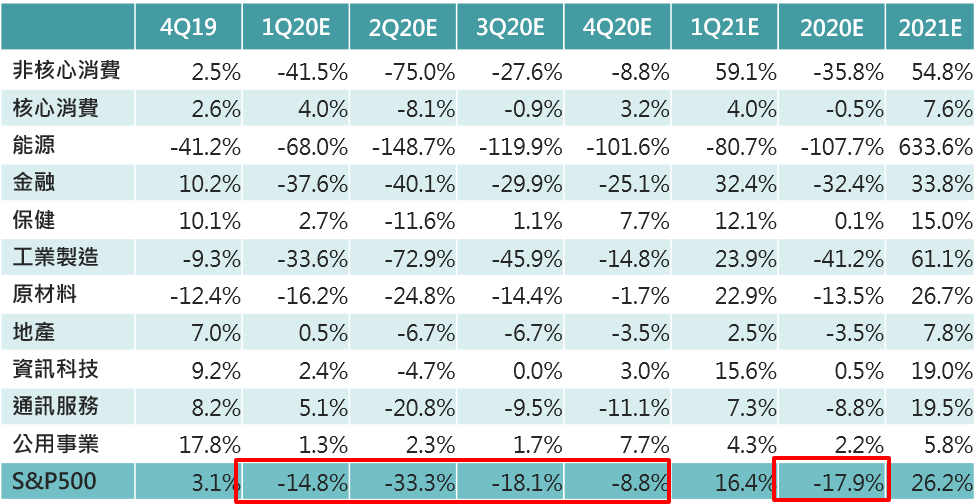 即便美國經濟封鎖力度在全球各國落於中段班,但高盛首席經濟學家認為,若將美國進入經濟封鎖狀態以GDP來評估,約達86%的經濟活動停滯,工作場所、零售和休閒活動減少超過40%,居家活動隨之增加,許多企業紛紛撤回獲利預估。根據Refinitv統計數據,市場預估第一季獲利年成長率已下修至-14.8%,第二季成長下修至-33.3%,第三季及第四季也分別下修至-18.1%和 -8.8%,2020年全年度S&P500企業獲利年成長預估則大幅下調至-17.9%。