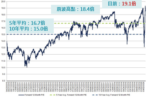 當前企業獲利受疫情衝擊程度仍在評估的情況下,股價已經率先出現強勁反彈,推升標普指數未來12個月本益比跳升至19.1倍,超過2月中旬美股創新高時的18.9倍,以及前波高點的18.4倍。