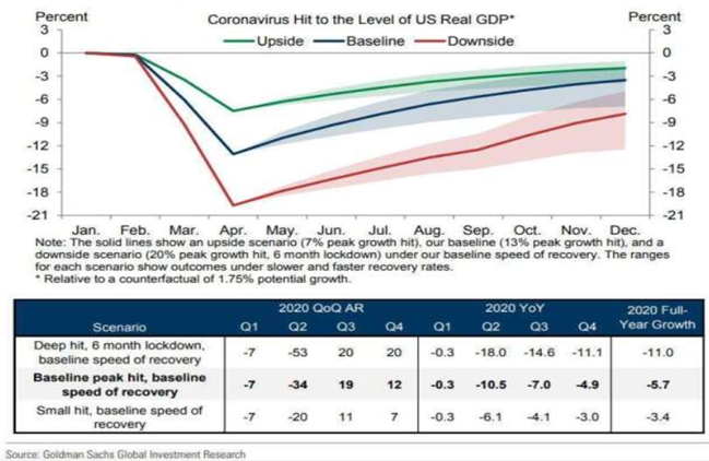 高盛認為,美國經濟復甦之路,取決於三個關鍵參數:峰值下降的深度、鎖定的時間長度以及重新開放過程中的恢復速度。高盛預測,經濟復甦將始於 5、6 月,然後逐步進行。以 GDP 成長來看,高盛預估第1季GDP年增率為-7%,第2季度為-34%,第3季起轉為雙位數正成長,2020年整體的年平均增長率為-5.7%。