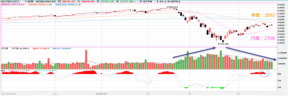 除本益比偏高的指數修正壓力之外,技術面而言,標普指數自2191點已經反彈本波跌幅的50%,指數短線面臨季線反壓,根據過去經驗,指數一舉突破站穩季線之上的機率不大,且KD易形成背離。最好的情況是在季線及月線之間震盪整理,待季線走平配合重啟經濟狀況良好再伺機上攻。