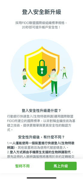 數位交易安全已經是全球產業共通的課題。國泰世華銀行導入廣受國際大型雲端及金融業者如Google、Amazon、Microsoft、Apple、Mastercard、Visa所採用的FIDO聯盟建立之國際標準規格,結合非對稱公開金鑰加密架構、生物特徵等技術,提供便利且安全的網路身分識別機制。只要用戶行動裝置的作業系統支援指紋、人臉或其他生物特徵辨識FIDO服務皆可有此升級服務 ,透過國泰世華旗下行動銀行APP內設定升級,簡單20秒就能輕鬆強化帳戶的安全性。升級FIDO後,用戶將經由APP的辨識驗證後透過公開金鑰加密傳輸形式登入行動銀行帳戶,同步降低客及網路釣魚的資安風險。