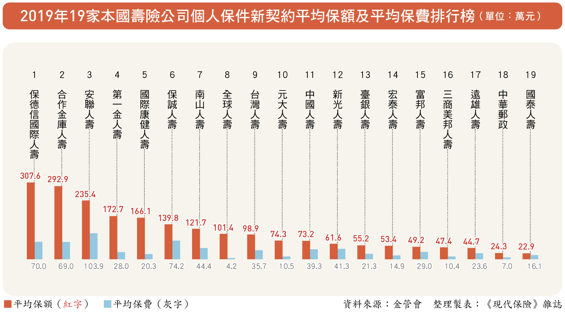 去年19家本國壽險公司的個人保件新契約平均保額較前一年度增加的,僅保德信國際、合作金庫、安聯、保誠、南山、全球、台灣、三商美邦、遠雄及中華郵政等16家。去年總保費收入前5大公司,除南山外,其他4家新契約平均保額都下降。