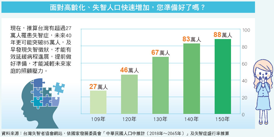 據台灣失智症協會的資料顯示,推估台灣十年後(民國120年)的失智人口將超過46萬人,屆時每100人之中就有2位罹患失智症;未來的47年中,失智人口預計以平均每天增加36人、也就是每40分鐘增加1人的速度驚人成長(註1)。