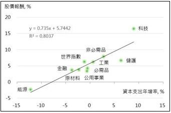 圖1:資本支出增速與股票表現具高度正相關