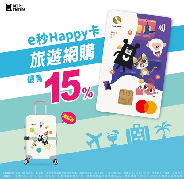 為了讓民眾能透過『e秒Happy卡』享受超值旅遊休閒娛樂,兆豐銀行特地推出5大Happy優惠,首先是(1)旅遊網購平台最高15%回饋(包括所有網購一率2.5%回饋;申辦電子帳單再享四大訂房網、三大旅行社及兩大體驗旅遊平台加碼2.5%回饋;外加Booking.com最高10%回饋;Hotels.com享92折優惠);(2)悠遊卡自動加值5%回饋;(3)單筆滿2千元享3期0利率;(4)ez訂電影全票33%折扣;以及(5)非網購一般消費0.1%捐贈《台灣黑熊保育協會》,消費兼做公益。