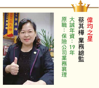 「我很喜歡大海,海納百川是我最欣賞的特質。」從事保險業二十餘年的蔡其樺,從不自我設限也對任何事物都保持著彈性。原本在保險公司服務的她,初接觸大誠保經時就被跨平台的多元商品深深吸引,蔡其樺坦言,行銷過程中最怕帶給客戶壓力,而大誠代理全業界最多家保險公司優質商品,以客戶立場出發規劃最適合的保障,不必受限單一公司,因此在行銷上輕鬆自信,客戶沒壓力,自然創造良好的互動。