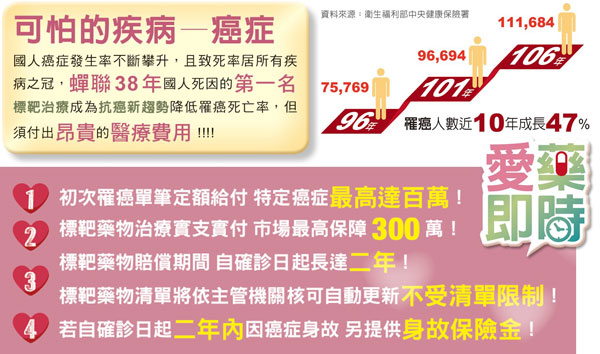 標靶藥物成為近年癌症治療的重要方式之一,但天價費用卻是許多癌症病人的最大難題,為提供客戶完整的保障,富邦產險推出業界獨家的個人實支實付型「愛藥即時」癌症標靶治療藥物費用健康保險,提供高額癌症標靶治療藥物費用保障,保額達300萬元、確診日起兩年都有保障,皆為市場最優,為患者家庭分擔龐大的經濟壓力,期望透過保險提供客戶品質更好的治療選擇權。