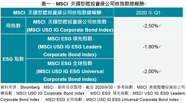聯邦2023年到期全球ESG優質債券基金(本基金有一定比重得投資於非投資等級之高風險債券且配息來源可能為本金)預定經理人余政民指出,從政府陸續推動限塑政策、要求上市公司必須編製企業社會責任報告書等,都顯現 ESG 的影響力正在全面擴散,而政府相關產業為配合政府政策,將成為ESG先鋒部隊。余政民分析,政府相關產業較一般產業優先被納入ESG指數,更能防範下檔風險!從2020年第一季來看,雖因新冠疫情來勢洶洶,導致全球金融市場劇烈震盪,但MSCI 美國整體投資級公司債指數總報酬(詳見表一)顯示,具備ESG指數之報酬率僅下跌1.80%至2.00%,跌幅遠小於整體市場的2.50%,疫情過後,更顯現致力於ESG的企業承受波動能力更強!