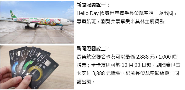 「世界哈囉日類出國專案航班」將於即日起在長汎旅行社官網提供長榮航空聯名卡友購買,刷長榮航空聯名卡支付可享經濟艙2,888元+1,000哩優惠價,商務艙輕奢體驗價為4,888元+1,000哩,並可使用機場貴賓室;國泰世華一般卡友則可於10月23日起刷卡支付全額購買,以3,888元購買經濟艙座位,商務艙5,888元,堪稱最物超所值的一趟飛航環島旅行 ,貼心提供聯名卡友讓帳戶裡的哩數聰明活用。