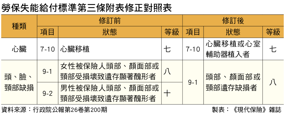 不過由於社會環境已變化,為落實性別平權,勞動部日前修正「頭、臉、頸部」失能給付標準,不分性別,失能等級一律為第八級,以保障男性勞保被保險人權益。未來只要是頭部或顏面、頸部受傷,經治療一段期間、符合給付標準表所訂的標準後,無論男女,都可領到360日平均月投保薪資的失能給付。