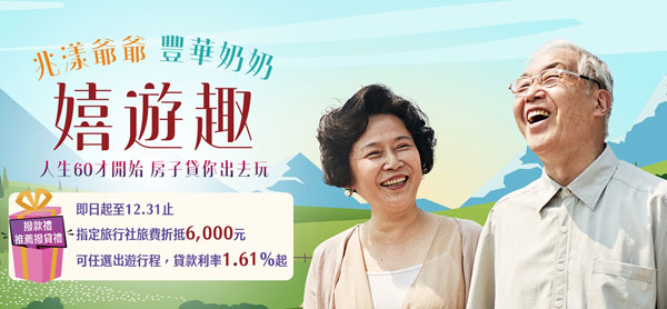 為鼓勵民眾儘早著手規劃退休生活,兆豐銀行推出「兆漾爺爺 豐華奶奶 嬉遊趣」活動,即日起到2020年12月底,凡於活動期間內推薦親友或自行申辦歡喜樂活-以房養老方案,並於12月底前撥款完成,推薦人與借款人均可獲得價值新台幣6,000元的指定旅行社國內旅遊折抵金抽獎機會,有退休計劃的民眾不妨趁這波活動洽兆豐銀行辦理!