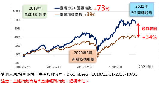 國泰台灣5G+ETF(00881)經理人蘇鼎宇指出,觀察2019年各國陸續啟動5G計畫迄今,臺灣5G+通訊指數漲幅高達73%,表現較台股勝出近一倍、超額報酬逾3成,這股勢頭有望在蘋果iPhone 12等5G新機帶動下續延,近日美國晶片大廠高通也表態看好5G升級需求,預測明年5G晶片有望熱賣超過5億顆,如此將使台灣5G供應鏈及相關類股未來表現更值得期待。