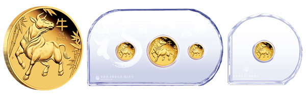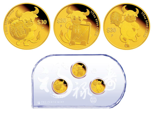 本套牛年福祿壽系列金幣全套3枚,包含「滿福金牛」、「聚財金牛」及「長壽金牛」各1枚,均為1/5英兩規格,各有吉慶的主題圖案設計,象徵祥瑞順旺的大好運勢。本套金幣全套售價80,980元,全球發行量2,000套。客戶亦可購買單枚1/5英兩「滿福金牛」金幣,每枚售價28,800元。