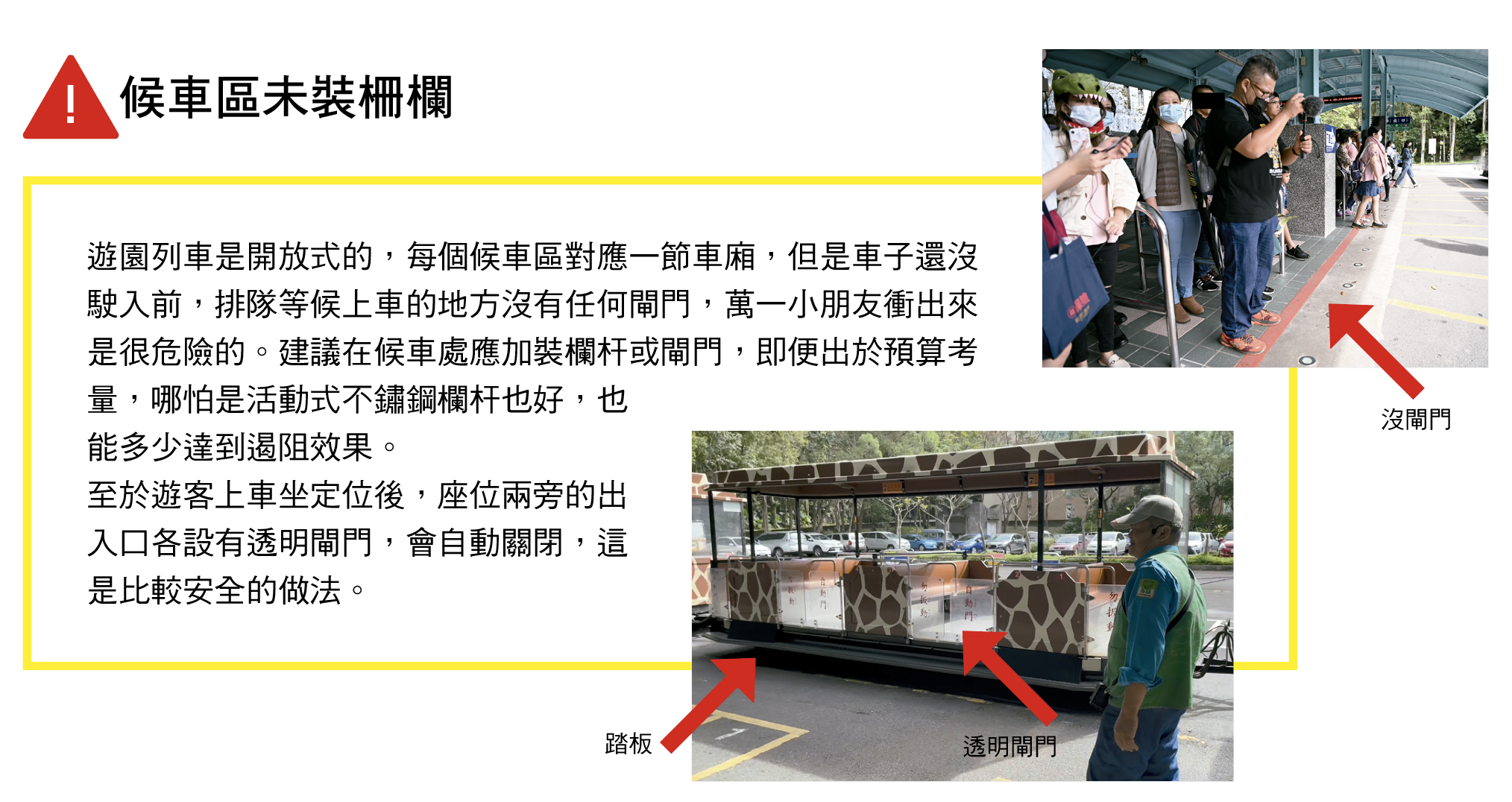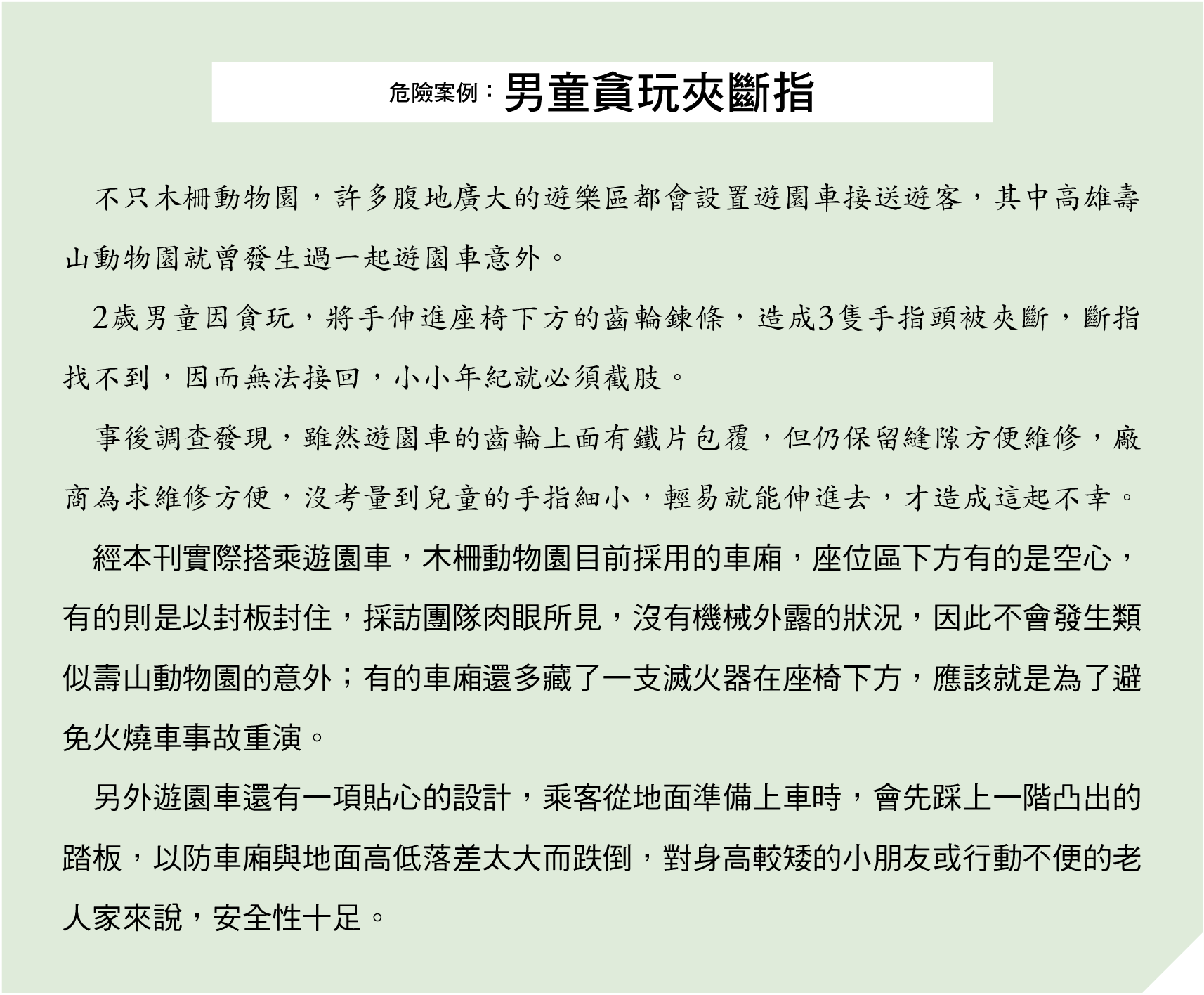 搭遊園車受傷,有強制車險的保障嗎?乘客會不會求償無門?動物園候車區的柵欄出了什麼問題?遊園列車是否有機械外露的情況?除了搭乘意外,動物園內還可能有哪些風險?