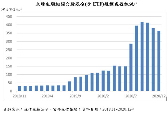而在投資主題上,余美香指出,近年來不僅永續投資概念蔚為全球風潮,該概念在台灣也逐漸受到投資人重視。如永續主題相關的台股基金包含ETF,規模自2019年初的不到新台幣30億元,快速增長至2020年第四季最高時約新台幣418億元,成長幅度逾12倍,顯示台股永續主題投資延續成長趨勢。而永續投資概念不僅注重獲利等財務表現,同時重視永續經營能力,包含環境保護、社會責任、公司治理等層面,謀求內外在共好互利,以達企業永續發展之目的,相較於短線投機表現,更重視長期的績效表現與營運品質,因此亦與價值型投資的理念不謀而合,亦可作為投資人現階段投資的參考依據之一。
