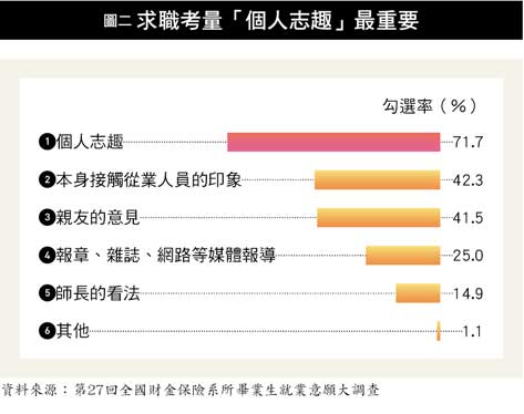 《現代保險》雜誌今年第二十七回「全國財金保險系所畢業生就業意願大調查」,鎖定全國三十三所大學的財務金融、財務資料、精算、風險管理、保險等學系與研究所應屆畢業生,共收回有效問卷二○四○份。