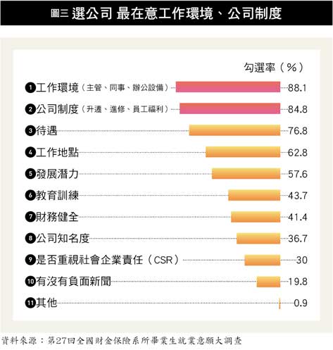 金融保險業之所以稱為「金飯碗」,就是因為薪資待遇比其他行業更高。但有趣的是,新鮮人在挑選公司時,「待遇」並不是首要考量,而且也只排名第三(詳圖三)。