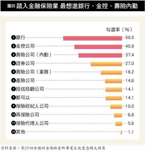 至於有意從事金融工作的科班生,最嚮往的金融機構,「銀行」再度榮登寶座,是至今乃不敗的首選,勾選率也有微幅提升,從去年的四十七.六%來到今年的五十.五%(詳圖四),成長約三個百分點。