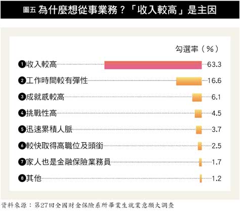 今年「收入較高」的勾選率為六十三.三%,與去年的五十九.九%相比,成長三.四個百分點,而「工作時間較有彈性」今年勾選率為十六.六%,與去年的二十.九%相比,則下降四.三個百分點,「一增一減」反映了業務工作收入高,在科班新鮮人眼中的重要性,愈來愈重要了。
