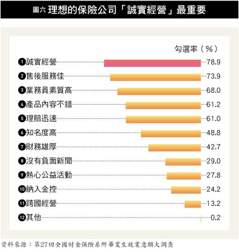 今年科班生認為「理想的保險公司應具備的條件」,「誠實經營」再度拿下第一名,勾選率達七成九,「售後服務」緊追在後,排名第二,勾選率七成四(詳圖六)。