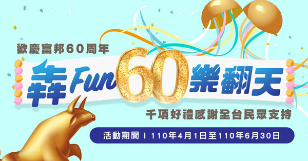 為慶祝富邦集團成立60週年,富邦人壽特別推出「犇Fun60樂翻天」包含投保抽獎與互動問答兩部份,總計超過1,000名的中獎機會、獎項現金價值近600萬。投保抽獎部分,於110/4/1至110/6/30期間,投保個人新契約保單,單張保單實繳保費(躉繳、彈性繳、增額保費以10%計算)每達新臺幣3萬元就可獲得一次抽獎資格、新臺幣6萬元則有兩次以此類推,有機會獲得現金和momo紅利金等獎項,最高獎金為新臺幣60萬元;另為彰顯富邦人壽致力於ESG的企業形象,以保障、保戶服務、環境永續成績為主題設計線上互動問答題目,只要投過業務員邀請作答,完成問答就有機會抽到3萬元獎金及最新型的iPhone 12及Dyson空氣清淨機,詳情請上活動網頁查詢。