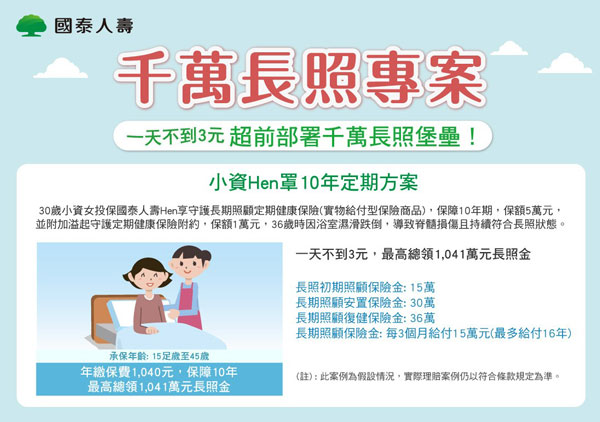 「國泰人壽千萬長照」專案中,最低一天不到3元,即可擁有上千萬的長照保障,以30歲女性投保「10年定期方案」【即投保國泰人壽Hen享守護長期照顧定期健康保險(實物給付型保險商品)(保障10年期/保額5萬元),附加國泰人壽溢起守護定期健康保險附約(保額1萬元)】為例,年繳保險費1,040元,最高總領1,041萬元保險金,假設在保障期間內因疾病或意外持續符合保單條款約定的長期照顧狀態,可先領一次給付的保險金81萬元(含長照初期照顧保險金15萬元、長期照顧安置保險金30萬元、長期照顧復健保險金36萬元)解決長照初期急需用錢的燃眉之急,每3個月再給付15萬元長期照顧保險金,最多給付64次(16年),共960萬元,不用擔心每月固定支出的看護費用及耗材雜支。
