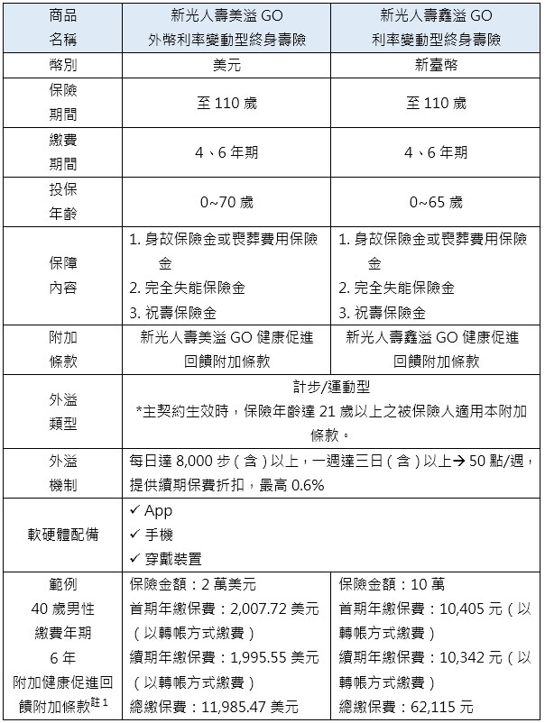 「新光人壽美溢GO外幣利率變動型終身壽險(定期給付型)」與「新光人壽鑫溢GO利率變動型終身壽險(定期給付型)」繳費年期為4年期及6年期,提供終身保障(至110歲),保費折扣上限2%、轉帳繳費折扣1%,折扣合計最高3%。身故保險金亦可約定比例及年期以分期定期保險金給付予受益人,俾能妥善照顧遺族,達成資產傳承與規劃。此外,針對保險年齡達21歲以上的被保險人,自動附加「健康促進回饋附加條款」,並利用日行8,000步,還有機會最高享有0.6%的續年度保費健康促進回饋折扣,讓保費總折扣最高可達3.6%,且將可以透過回饋金機制,加大保障。