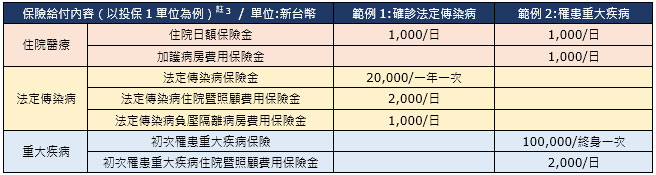 舉近期已被列為法定傳染病的新冠肺炎為例,在保戶選擇投保1單位(保險金額新台幣1,000元,以下同)的情況下,如不幸在投保期間內確診新冠肺炎,除了不需等待期外,可獲得法定傳染疾病保險金新台幣2萬元(一年一次為限)。若因此而住進負壓隔離病房,則可同時獲得法定傳染病負壓隔離病房費用保險金新台幣1,000元與住院日額保險金新台幣1,000元;以及法定傳染病住院暨照顧費用保險金日額新台幣2,000元之給付,意即保戶因新冠肺炎確診入住負壓隔離病房,每日最高可獲得新台幣4,000元保險金。此外,如保戶在不同保單年度確診不同法定傳染病,皆可理賠保險金新台幣2萬元之一次性給付,減少保戶因罹患法定傳染病產生的經濟負擔。