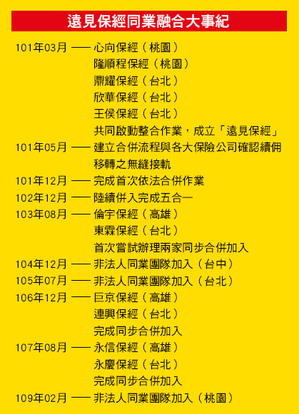 許學智董事長深知保險經紀人公司是市場趨勢,然而若公司經濟規模不夠大,就無法擴增業務量,無論在提供保險規劃或是與保險公司取得商品合作等方面都會窒礙難行。因此加入遠見之前,他積極在市場上尋找合併機會。與競業結盟,他期待要建立在平等與共利的基礎上,因此尋覓多年後,他最在意的三個條件「原有公司的制度續存、行政作業分工、獲得更大利益」,只有遠見保經可以解決。
