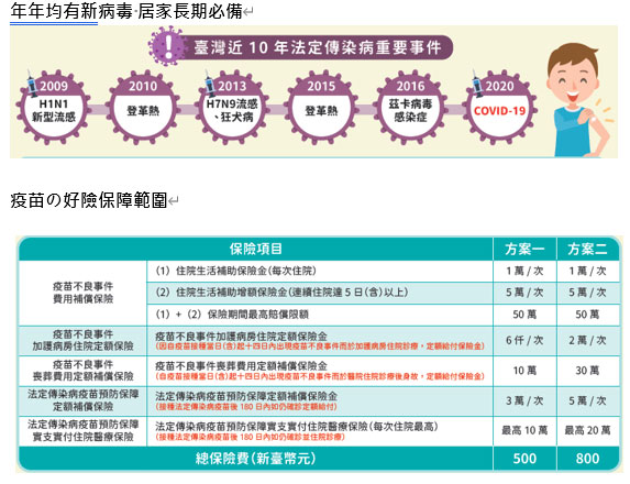 明台產險說明,近十年來國內發生各項法定傳染病,包含H1NI新型流感(2009)、登革熱(2010、2015)、以及新冠肺炎(2020)均有施打疫苗的需求,因此疫苗險也將成為全家人居家應備的健康險保單。
