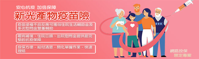 配合疫情期間盡量減少人與人的接觸,減低染疫機率,新光產物積極設立網路投保專區,提供民眾免出門、免接觸就有萬全保障。疫苗險網路投保專案,一年保費僅需228元,用銅板價即可獲得涵蓋全疫苗接種後的不良反應,以及針對COVID-19疫苗接種後仍染疫兩大面向保障。