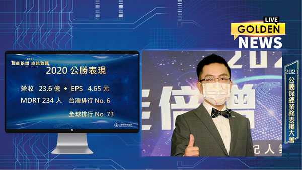 面對市場的艱鉅環境,公勝保經透過精準的商品策略定位與優異制度吸引人才加入,2020年無畏大環境險惡,寫下2大輝煌紀錄,首先是全年營收續創新高,總營收超過23億元,創造每股盈餘(EPS)4.65元的佳績,董事會也決議派發3.5元現金股利,讓股東們共享經營成果。第二是優質的業務團隊素質深獲肯定,取得百萬圓桌協會(MDRT*註)的人次達234人,為台灣排名第6、全球排名73的公司。