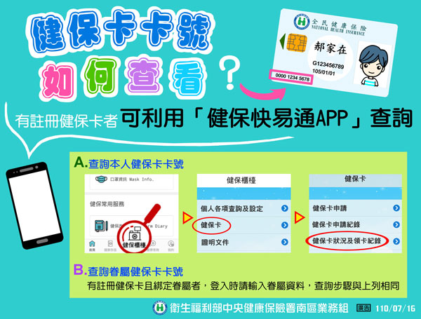 民眾可參考所附圖示步驟查詢健保卡卡號,「全民健保行動快易通」APP尚有多項便民服務,歡迎利用。相關作業如有不清楚或有疑問,可撥打健保署諮詢專線︰0800-030-598,手機請改撥02-4128-678洽詢。
