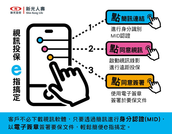 儘管新冠肺炎疫情稍有趨緩,但防疫仍是一場長期抗戰,為避免有投保需求的客戶外出與業務員接觸增加群聚風險,新光人壽遠距投保持續升級。金管會保險局核准試辦遠距投保服務,客戶不必下載視訊軟體,只要透過簡訊進行身分認證(MID),以電子簽章簽署要保文件,輕鬆簡便e指搞定。全程無紙化資料不落地,讓客戶享有投保快速便利、免接觸的服務體驗,減少雙方染疫風險。