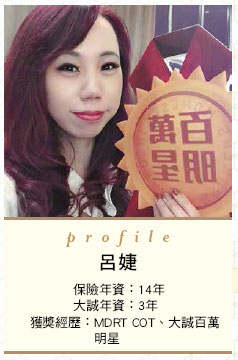 大誠商品多元,讓她可以不急於特定單項銷售,而是站在客戶立場細心思量,「推薦給客戶前,一定要自己先認同,每個人都要為自己的規劃負責,不要貪圖一時成交,讓業績變業障!」呂婕打趣地說。此外她更強調友善的制度讓人沒有壓力,但她卻一直秉持高度自律,維持展業活動量不能懶散。面對變革快速的業態,呂婕不斷地專心學習並保持謙卑態度,以跟上客戶需求不被市場淘汰,對於不擅長的領域更是虛心求教,認為人與人之間都能互為彼此的老師。