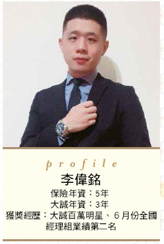 從平面設計師轉職為專業保險顧問的李偉銘坦言,過去從很排斥保險到全心投入,是因深入了解後,對保險精神的高度認同。李偉銘自許是一位「分享者」,喜歡透過交朋友的方式將保險觀念帶給客戶,他認為一名將「成交」視為首要任務的業務員,是無法打動客戶的。因此總是從「分享」出發,不僅線上線下交流關心,也從交流日常生活開始,察覺個人需求再自然地帶入保險話題,以解決客戶當前的擔憂,積極認真的服務態度,讓客戶有需要時,總是第一時間想到他!